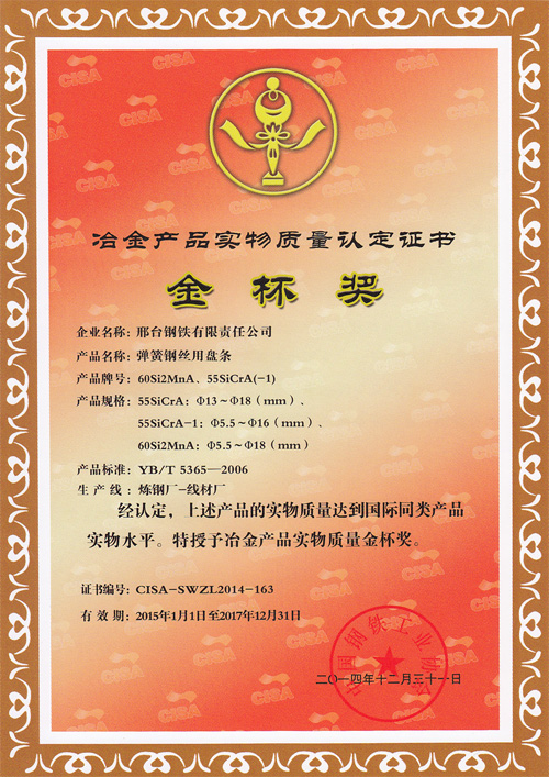 - The φ13~18mm wire rod 55SiCrA and φ5.5~16mm wire rod 55SiCrA-1 for spring awarded the 2014 Gold Cup Prize for Metallurgy products.This marks the product quality has reached the international quality level. So far, a total of 30 grades of 10 kinds products of Xingtai Steel awarded the Gold Cup …