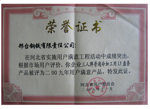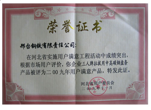 三人牌拉拔用中高碳鋼盤(pán)條被評(píng)為2009年河北省用戶(hù)滿(mǎn)意產(chǎn)品
