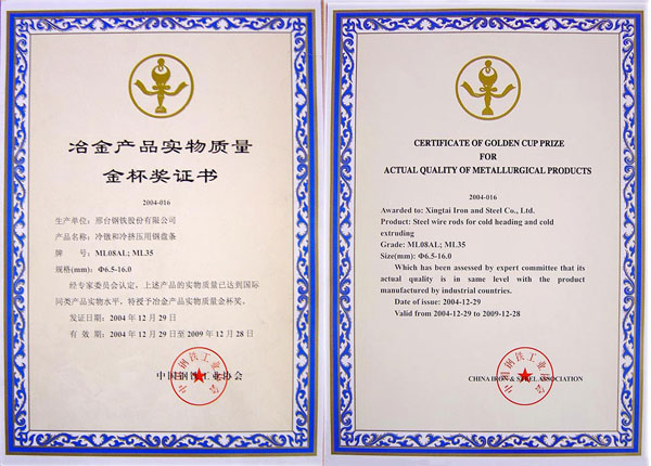 冷鐓和冷擠壓用鋼盤條ML08AL,ML35獲冶金產(chǎn)品實(shí)物質(zhì)量金杯獎(jiǎng)