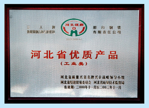 三人牌連續(xù)鑄鋼方坯與矩形坯獲河北省優(yōu)質(zhì)產(chǎn)品(工業(yè)類(lèi))
