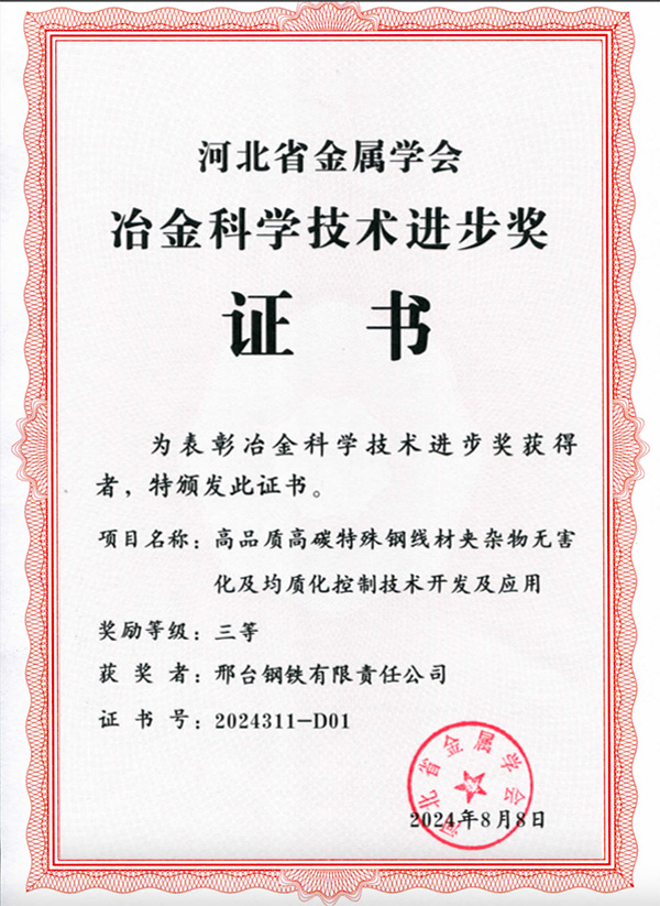 2024年公司拉拔用中高碳鋼盤條SWRH82B產(chǎn)品獲得冶金產(chǎn)品實物質(zhì)量品牌培育產(chǎn)品(金杯優(yōu)質(zhì)產(chǎn)品)認(rèn)定證書,簡稱金杯獎。“冶金產(chǎn)品實物質(zhì)量品牌培育”評選活動于24年3月啟動,由中國鋼鐵工業(yè)協(xié)會主辦,金杯獎是中國鋼鐵工業(yè)協(xié)會組織的冶金行業(yè)唯一的比較權(quán)威的獎項。