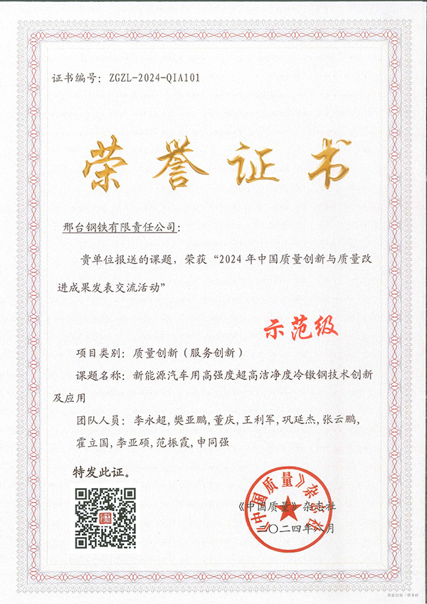 2024年8月,邢鋼《新能源汽車用高強度超高潔凈度冷鐓鋼技術(shù)創(chuàng)新及應(yīng)用》課題榮獲“2024年中國質(zhì)量創(chuàng)新與質(zhì)量改進(jìn)成果發(fā)表交流活動”最高級別的“示范級”榮譽。