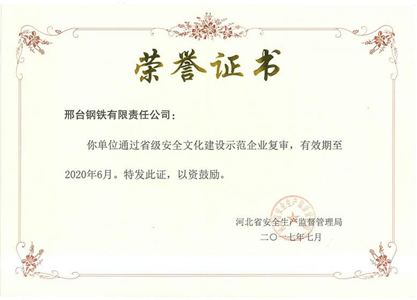 2014年,邢鋼安全文化建設取得初步成果,首批獲得“省級安全文化建設示范企業(yè)”。2017年7月,邢鋼順利通過復審再獲“省級安全文化建設示范企業(yè)”。