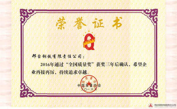 邢鋼于2013年獲得全國質(zhì)量獎,獲獎后邢鋼繼續(xù)實(shí)踐《卓越績效評價準(zhǔn)則》,深入推進(jìn)卓越績效管理模式,持續(xù)改進(jìn),不斷追求卓越。2016年9月全國質(zhì)量獎評審活動領(lǐng)導(dǎo)小組組織專家對邢鋼進(jìn)行了全國質(zhì)量獎獲獎三年后的現(xiàn)場確認(rèn),通過專家小組的現(xiàn)場提問、材料匯報、生產(chǎn)現(xiàn)場的參觀,邢鋼順利通過了“全國質(zhì)量獎”獲獎三年后確認(rèn)并頒發(fā)證書。