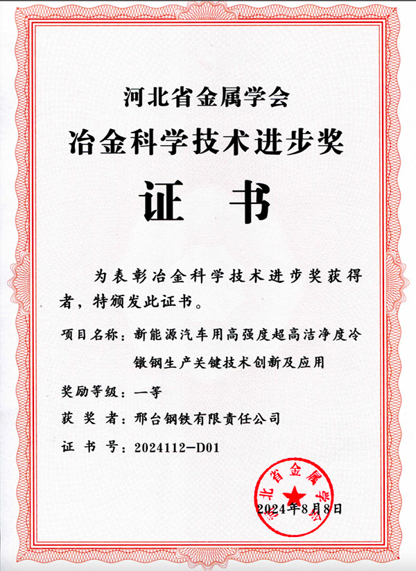 2024年8月8日,邢鋼《新能源汽車用高強度超高潔凈度冷鐓鋼生產(chǎn)關鍵技術創(chuàng)新及應用》項目榮獲河北省冶金科學技術進步獎一等獎。