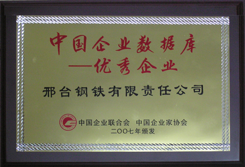 2007年12月,邢鋼榮獲由中國(guó)企業(yè)聯(lián)合會(huì)、中國(guó)企業(yè)家協(xié)會(huì)頒發(fā)的“中國(guó)企業(yè)數(shù)據(jù)庫(kù)優(yōu)秀企業(yè)”榮譽(yù)稱(chēng)號(hào)。