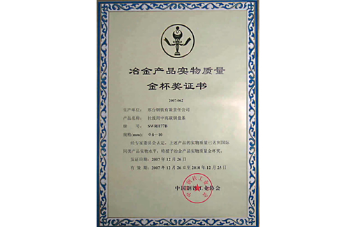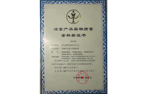 2007年12月,邢鋼冷鐓和冷擠壓用鋼盤(pán)條獲冶金產(chǎn)品實(shí)物質(zhì)量金杯獎(jiǎng)。