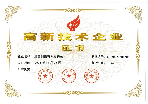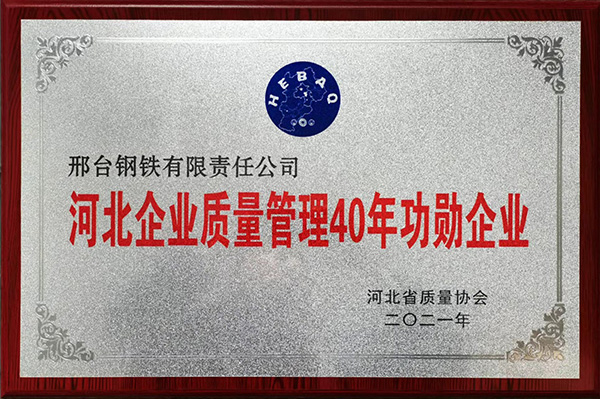 2022年7月,河北省質(zhì)量協(xié)會公布了“河北企業(yè)質(zhì)量管理40年功勛企業(yè)名單”,邢臺鋼鐵有限責任公司榮獲“功勛企業(yè)”榮譽稱號。