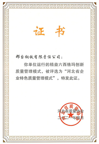 2021年4月,由河北省質(zhì)量協(xié)會評選的首批“河北省企業(yè)特色質(zhì)量管理模式”名單揭曉。邢鋼申報的“精益六西格瑪創(chuàng)新管理模式”,憑借理念先進、方法科學、措施易行、效果明顯等優(yōu)勢上榜首批名單。