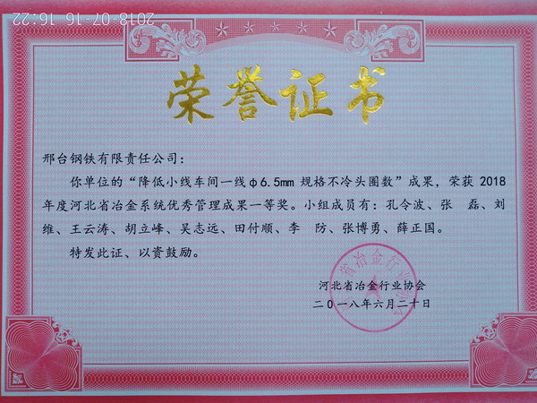 河北省冶金行業(yè)協(xié)會于6月份在秦皇島召開了“全省冶金行業(yè)質(zhì)量管理優(yōu)秀成功發(fā)布會”,邢鋼線材廠小線車間工藝技術QC小組《降低小線車間一線6.5mm規(guī)格不冷頭圈數(shù)》在發(fā)布會上進行了成功發(fā)布,獲得本次發(fā)布會一等獎的好成績。