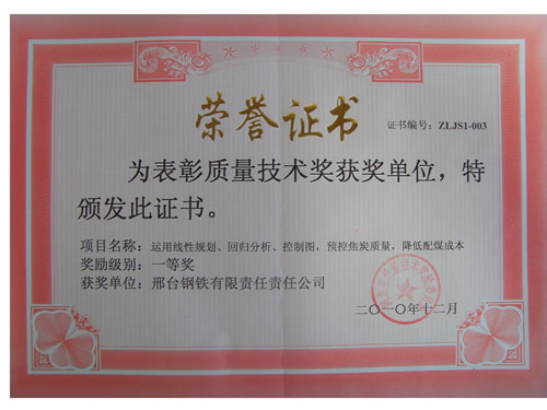 - 近日獲悉,我公司申報(bào)的“運(yùn)用線性規(guī)劃、回歸分析、控制圖預(yù)控焦炭質(zhì)量,降低配煤成本”質(zhì)量技術(shù)成果,經(jīng)河北省質(zhì)量技術(shù)獎(jiǎng)勵(lì)委員會(huì)評選,獲得一等獎(jiǎng)。該項(xiàng)目是焦化廠運(yùn)用質(zhì)量統(tǒng)計(jì)技術(shù)工具經(jīng)過實(shí)踐取得的一項(xiàng)質(zhì)量技術(shù)成果。通過實(shí)施該項(xiàng)目,配合煤成本比2008年降低了4775萬元,保持了焦炭質(zhì)量的持續(xù)穩(wěn)定。