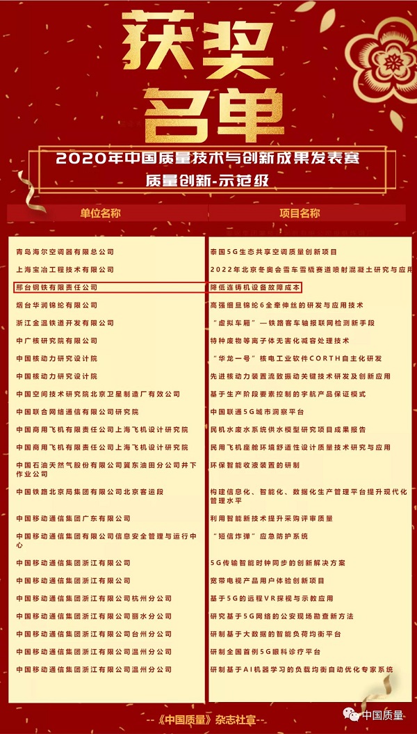 - 2020年9月15日-20日,邢鋼應(yīng)邀參加了《中國質(zhì)量》雜志社主辦的“2020年中國質(zhì)量技術(shù)與創(chuàng)新成果發(fā)表賽”,得到專家評委一致好評和現(xiàn)場觀眾高度認(rèn)可,《降低連鑄機(jī)設(shè)備故障成本》榮獲質(zhì)量創(chuàng)新示范級成果、《降低燒結(jié)固體燃耗》榮獲精益項(xiàng)目專業(yè)級成果、《降低SCM435系列冷鐓鋼裂紋率》等其它6個(gè)項(xiàng)目榮獲改進(jìn)級成果。