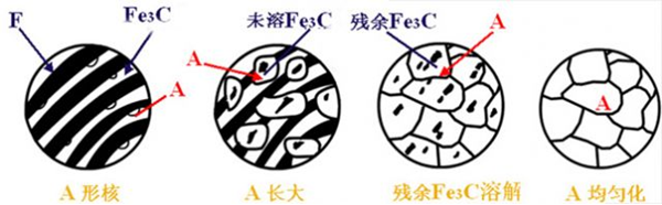 共析鋼奧氏體化:熱處理加熱至Ac1以上時(shí),將全部奧氏體化,過(guò)程如下圖。