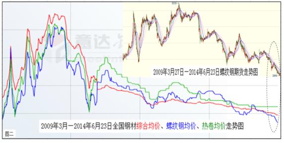 底線的提高,勢必助推中國經(jīng)濟大勢呈現(xiàn)前低后高的走勢。而經(jīng)過長期低迷的中國鋼材市場,也已經(jīng)具備逐漸走強的兩大要素:一是鋼市走強的外在環(huán)境趨好(見上圖一)。包括上半年推出一系列微刺激效應(yīng)逐漸顯現(xiàn),下半年由于經(jīng)濟增長底線提高,以及持續(xù)加推的動力措施等合成發(fā)酵,定會形成遠(yuǎn)比上半年良好的鋼市發(fā)展環(huán)境;二是鋼市走強的內(nèi)在動能充沛(下圖二)。鋼材價格經(jīng)過長期下跌后,已經(jīng)下穿了所有的技術(shù)阻力位,使業(yè)內(nèi)根本無法從技術(shù)面進行詮釋。但從價值規(guī)律、市場規(guī)律以及基本面情況看,目前鋼材價格的底部特征已經(jīng)十分明顯,空方量能也已近衰竭。因此,經(jīng)過短時間的整固蓄勢后,震蕩上揚應(yīng)該是后期運行的主基調(diào)。如果再結(jié)合宏觀上經(jīng)濟增長底線的提高,下半年鋼材價格恢復(fù)性上揚既在情理之中,也是勢所必然。所以,基于經(jīng)濟和鋼市大勢筆者作出,下半年全國鋼材價格勢必高于上半年的預(yù)測。