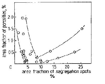 中心偏析與中心疏松不是線形關(guān)系,如下圖所示,中心疏松面積隨著中心偏析面積的減少而減少,是由于溶質(zhì)富集鋼液不容易滲透到凝固收縮中;中心疏松面積隨著偏析面積的增大而增大,溶質(zhì)富集鋼液容易滲透到凝固收縮中。
