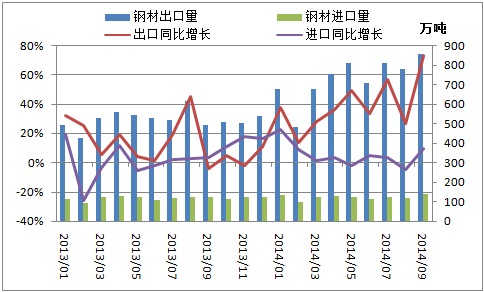 2014年9月我國出口鋼材852萬噸,創(chuàng)下歷史新高,同比大增73.2%。一方面,上年同期基數(shù)較低,導(dǎo)致9月鋼材出口同比增速上升明顯。另一方面,9月我國鋼材出口均價加速下跌,國際競爭優(yōu)勢明顯,進一步刺激鋼材出口。當(dāng)月鋼材出口均價739美元/噸,環(huán)比下降4.9%,同比下降10.7%。