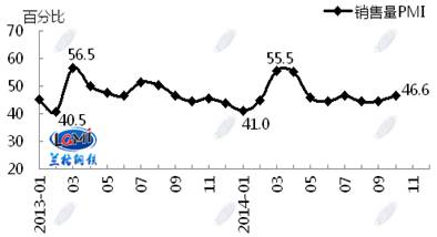 =鋼鐵市場活躍度略有好轉(zhuǎn)。10月銷售量指數(shù)為46.6%,較上月上升2.1個百分點(見圖3),表明10月份鋼貿(mào)企業(yè)銷售量增加,鋼鐵流通市場活躍度略有好轉(zhuǎn)。進(jìn)入10月,隨著鋼鐵原料鐵礦石及鋼坯價格的先漲后跌,鋼材市場價格也呈現(xiàn)先漲后跌走勢,市場成交總體有所好轉(zhuǎn)。從區(qū)域看,六大區(qū)域銷售量指數(shù)除東北、西北地區(qū)有所下降外,其余地區(qū)均出現(xiàn)不同程度的回升。