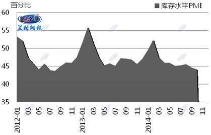 =鋼鐵下游訂單增加。10月總訂單指數(shù)為46.0%,環(huán)比上升2.2個百分點(見圖4),表明鋼鐵下游需求有所好轉(zhuǎn)。其中,國內(nèi)訂單指數(shù)46.0%,較上月上升2.2個百分點,表明10月份鋼貿(mào)企業(yè)來自國內(nèi)用戶的訂單量有所增加,下游用戶需求好轉(zhuǎn)。出口訂單指數(shù)46.0%,環(huán)比下降1.3個百分點,顯示國外需求有所轉(zhuǎn)弱。