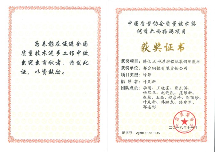 邢鋼榮獲2018年中國質量協(xié)會六西格瑪優(yōu)秀項目獎
