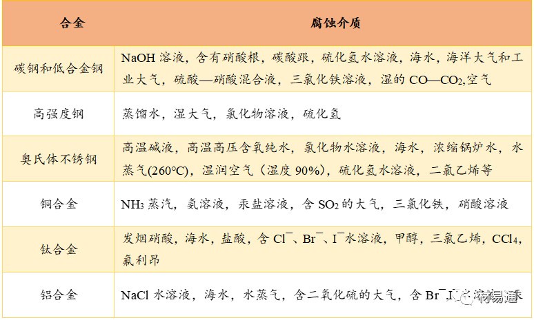 特定介質(zhì):特定組織環(huán)境(包括腐蝕介質(zhì)性質(zhì)、濃度、溫度),特定材料對于特定的溶液介質(zhì),才能發(fā)生應(yīng)力腐蝕。 例如,奧氏體不銹鋼—Cl離子溶液、低合金高強度鋼—潮濕大氣中。