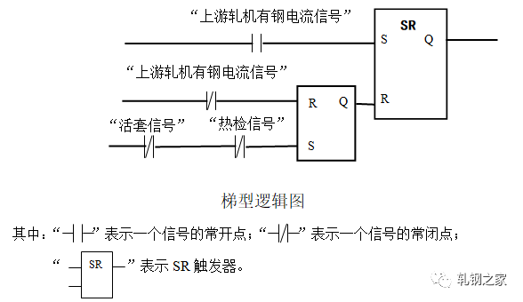 在軋件頭部進(jìn)入活套后面軋機(jī)前不允許起套輥升起;在軋件頭部進(jìn)入活套后面軋機(jī)后起套輥必須立即升起。當(dāng)軋件尾部離開活套前面軋件時,起套輥必須立即下降。為了準(zhǔn)確地起落套,我們首先,在活套的起落套的邏輯控制程序中設(shè)置了RS觸發(fā)器。只要下游機(jī)架“有鋼”活套就不能再次起落套。編程如下(梯型邏輯圖):其次,在起套和落套的處理上對延時時間采用了長度系數(shù)補(bǔ)償?shù)乃惴ǎ丛谟嬎愣〞r器的延時時間過程中將線材要走的長度(如兩機(jī)架間的距離)乘以一個百分比。這樣就可以:一、消除由于CPU軟件系統(tǒng)本身運行周期過長造成的定時計算誤差;二、靈活地適應(yīng)電氣開關(guān)和機(jī)械上氣閥等的動作滯后的不一致性,以使起套輥能較準(zhǔn)確地升起和落下。