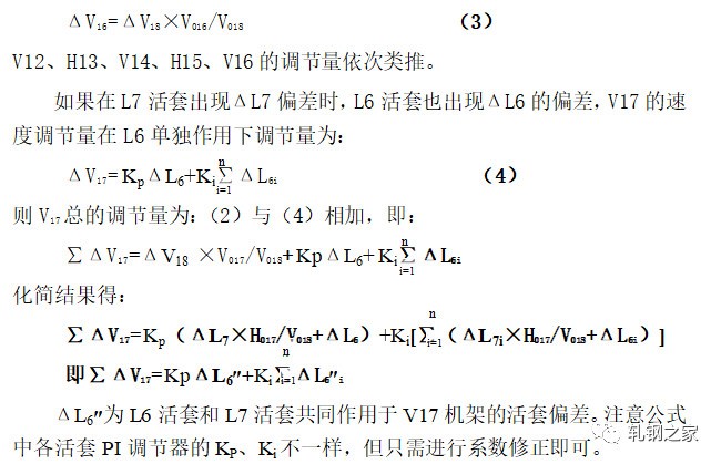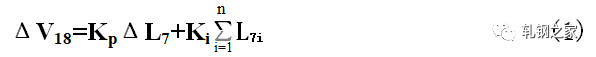 當(dāng)活套一旦形成以后,活套的實際高度立即由活套掃描器測得的值經(jīng)過PI調(diào)節(jié)器,輸出一個控制信號,通過控制上游軋機(jī),使活套大小得到調(diào)節(jié),使活套保持在設(shè)定的高度范圍。速度調(diào)節(jié)量是按逆流調(diào)速的方法,按同樣比例對軋機(jī)的工作速度進(jìn)行級聯(lián)調(diào)節(jié)。假如活套L7出現(xiàn)高度差為ΔL7,則V18機(jī)架的速度調(diào)節(jié)是: