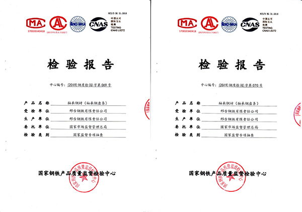 受國家市場監(jiān)督管理總局委托,2019年11月國家鋼鐵產(chǎn)品質(zhì)量監(jiān)督檢驗中心對邢鋼高碳鉻軸承鋼進(jìn)行了監(jiān)督抽查,判定依據(jù)為《2019年軸承鋼材產(chǎn)品質(zhì)量國家監(jiān)督專項抽查方案》,現(xiàn)場抽取了2個批次盤條,近日公司收到檢測報告2個,結(jié)論為:所檢項目符合GB/T18254-2016《高碳鉻軸承鋼》標(biāo)準(zhǔn)及抽樣方案,判定合格,報告中顯示,7大項29個項目結(jié)果全部高于該產(chǎn)品標(biāo)準(zhǔn),達(dá)到了高級優(yōu)質(zhì)鋼級別水平。