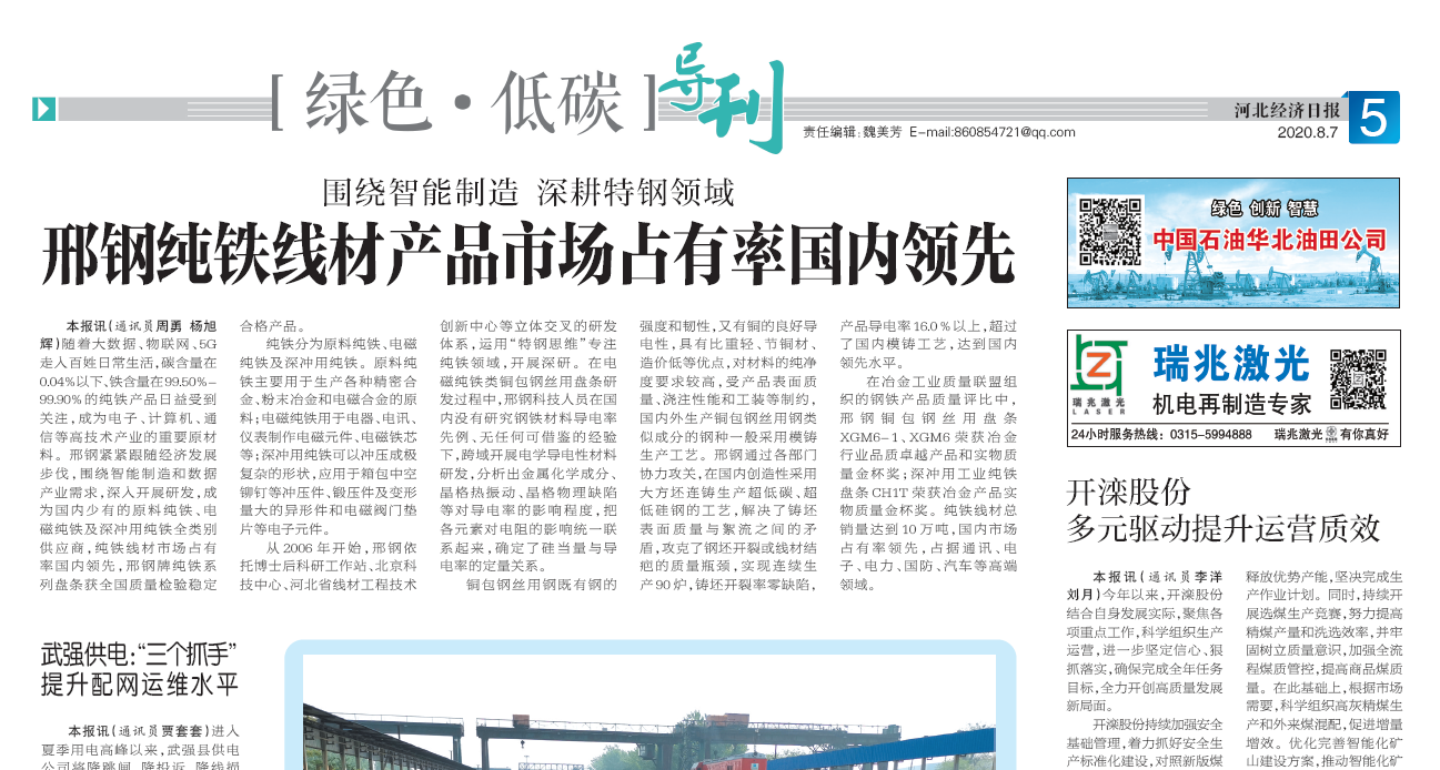在冶金工業(yè)質(zhì)量聯(lián)盟組織的鋼鐵產(chǎn)品質(zhì)量評(píng)比中,邢鋼銅包鋼絲用盤條XGM6-1、XGM6榮獲冶金行業(yè)品質(zhì)卓越產(chǎn)品和實(shí)物質(zhì)量金杯獎(jiǎng);深沖用工業(yè)純鐵盤條CH1T榮獲冶金產(chǎn)品實(shí)物質(zhì)量金杯獎(jiǎng)。純鐵線材總銷量達(dá)到10萬噸,國(guó)內(nèi)市場(chǎng)占有率領(lǐng)先,占據(jù)通訊、電子、電力、國(guó)防、汽車等高端領(lǐng)域。