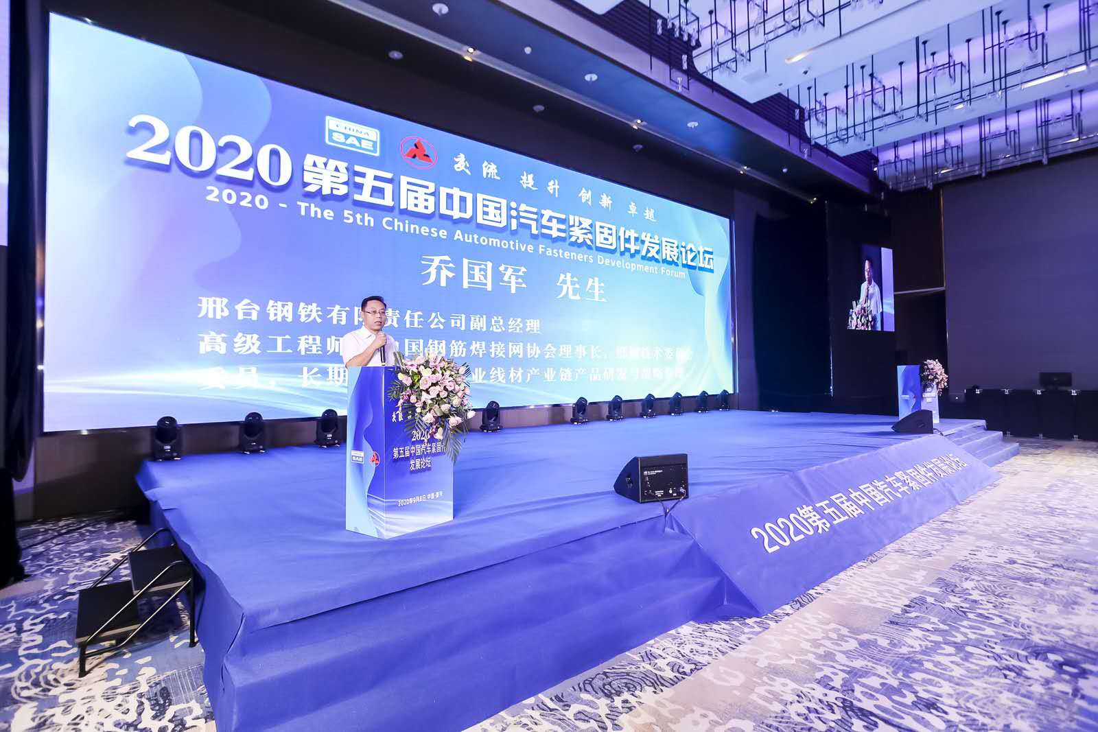 2020年9月8日,由中國汽車工程學會、中國汽車工程學會汽車防腐蝕老化分會主辦的2020第五屆中國汽車緊固件發(fā)展論壇在嘉興召開。汽車主機廠、零部件整機廠、緊固件企業(yè)、檢測機構(gòu)、科研院所、大專院校等180多家緊固件相關(guān)單位的科研人員、技術(shù)人員及管理人員400多人出席大會。本次大會由邢臺鋼鐵有限責任公司承辦,公司副總經(jīng)理喬國軍、總經(jīng)理助理兼銷售公司總經(jīng)理劉振民等參加了大會。