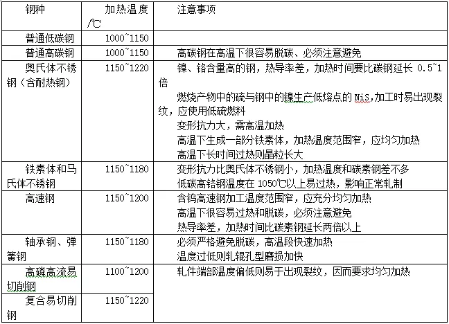 特別注意的是:對于碳鋼加熱溫度一般不能大于1300℃,大于此溫度,其一,鋼坯表面的氧化鐵皮會熔化(純氧化鐵皮的熔點為1377~1565℃,含有雜質(zhì)時降到1300~1350℃),從鋼表面上掉下來,露出新的表面,燒損迅速增加。其二,當(dāng)加熱溫度大于1300℃時,鋼坯很有可能會出現(xiàn)過熱或過燒。生產(chǎn)其它鋼種時更應(yīng)該注意最高加熱溫度。