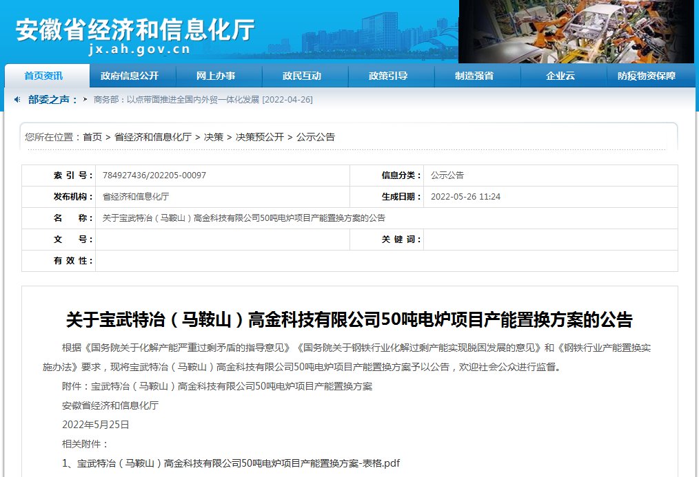 按照《國(guó)務(wù)院關(guān)于化解產(chǎn)能?chē)?yán)重過(guò)剩矛盾的指導(dǎo)意見(jiàn)》、《國(guó)務(wù)院關(guān)于鋼鐵行業(yè)化解過(guò)剩產(chǎn)能實(shí)現(xiàn)脫困發(fā)展的意見(jiàn)》和《鋼鐵行業(yè)產(chǎn)能置換實(shí)施辦法》要求,經(jīng)國(guó)務(wù)院國(guó)資委復(fù)函同意,擬將武鋼有限轉(zhuǎn)爐產(chǎn)能以及寶鋼特鋼電爐產(chǎn)能出讓?,F(xiàn)將武鋼有限1座90噸轉(zhuǎn)爐102萬(wàn)噸煉鋼產(chǎn)能、寶鋼特鋼1座60噸電爐14萬(wàn)噸煉鋼產(chǎn)能出讓方案予以公示,公示期為2022年5月25日-6月22日,歡迎社會(huì)公眾進(jìn)行監(jiān)督。