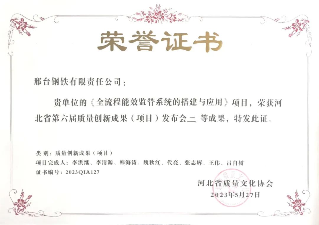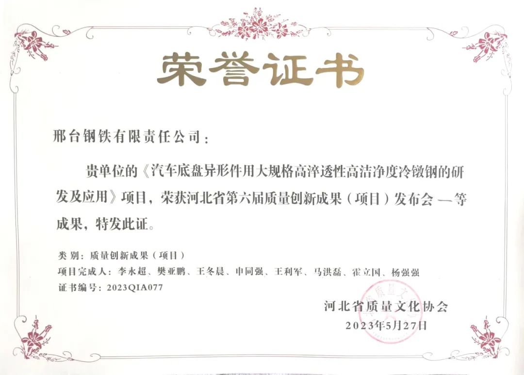 從近日召開的河北省第六屆質(zhì)量創(chuàng)新成果(項目)發(fā)布會上獲悉:邢臺鋼鐵有限責(zé)任公司(以下簡稱邢鋼)再次斬獲多項省級質(zhì)量創(chuàng)新成果殊榮,其中:《汽車底盤異形件用大規(guī)格高淬透性高潔凈度冷鐓鋼的研究及應(yīng)用》、《提高超低碳鋼成品碳含量≤50ppm比例》、《優(yōu)質(zhì)碳素鋼拉拔斷裂問題的改善與研究》榮獲示范級質(zhì)量創(chuàng)新成果;《提高6#高爐生鐵產(chǎn)量》和《全流程能效監(jiān)管系統(tǒng)的搭建與應(yīng)用》榮獲專業(yè)級質(zhì)量創(chuàng)新成果;《降低成品線材擦劃傷率》榮獲改進(jìn)級質(zhì)量創(chuàng)新成果。