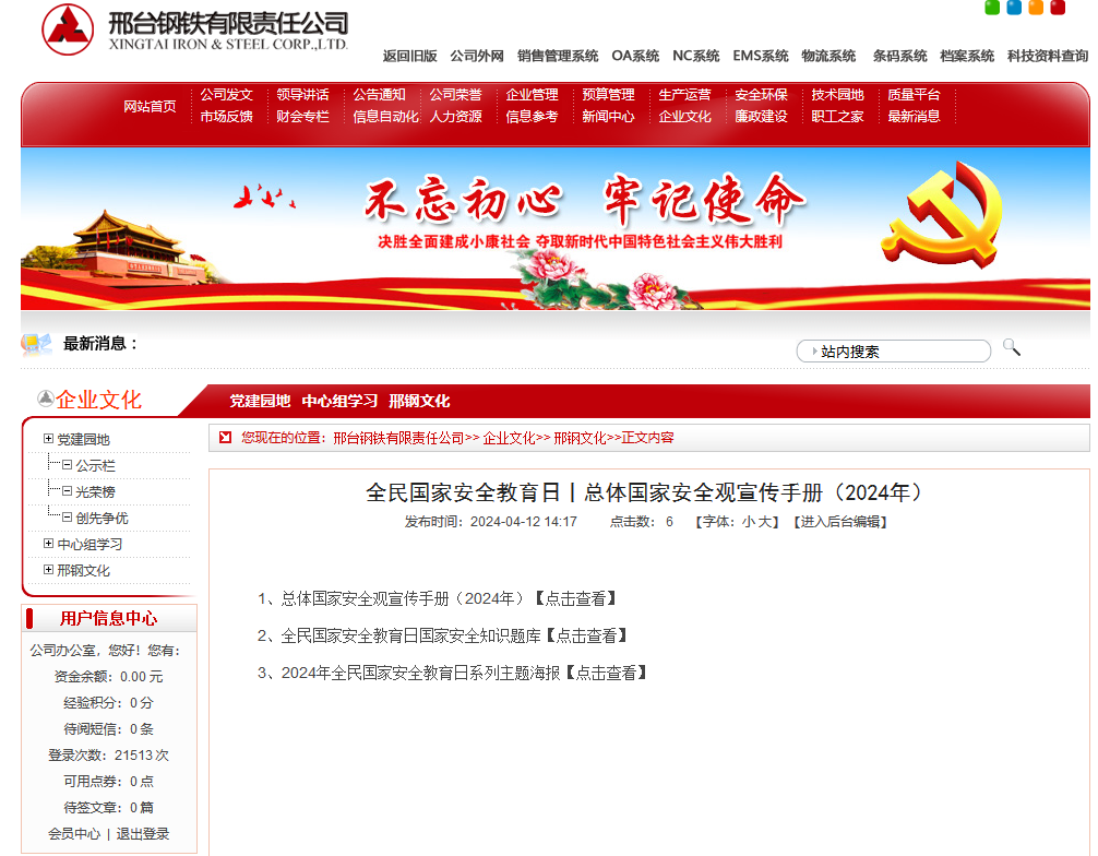 國家安全是民族復興的根基,社會穩(wěn)定是國家強盛的前提。4月15日是第九個全民國家安全教育日,為加強全民國家安全意識,提升維護和抵御安全風險能力,近日,邢鋼在全公司范圍內組織開展了“全民國家安全教育日”普法宣傳活動。