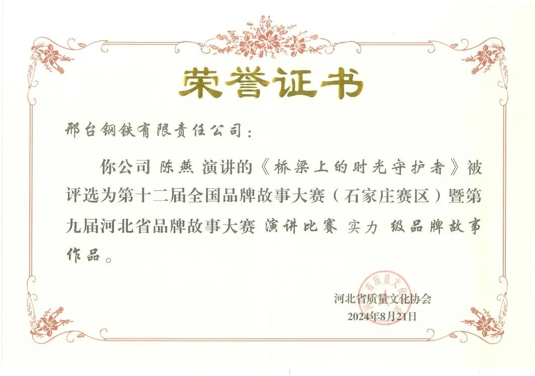 近日,由河北省質(zhì)量文化協(xié)會主辦的“第十二屆全國品牌故事大賽(石家莊賽區(qū))暨第九屆河北省品牌故事大賽”圓滿落下帷幕,邢鋼團(tuán)隊(duì)獲得多項(xiàng)殊榮。