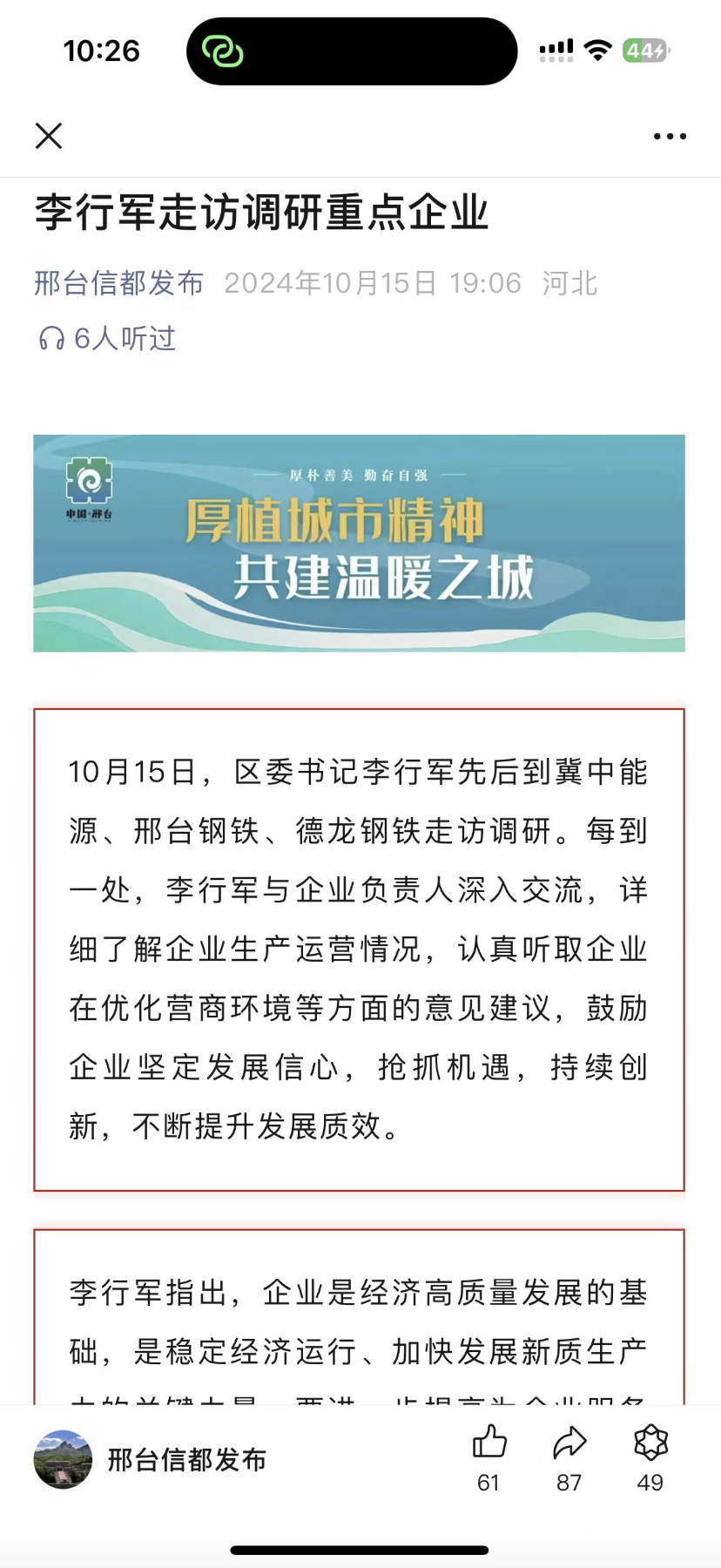 10月15日,區(qū)委書記李行軍先后到冀中能源、邢臺(tái)鋼鐵、德龍鋼鐵走訪調(diào)研。每到一處,李行軍與企業(yè)負(fù)責(zé)人深入交流,詳細(xì)了解企業(yè)生產(chǎn)運(yùn)營情況,認(rèn)真聽取企業(yè)在優(yōu)化營商環(huán)境等方面的意見建議,鼓勵(lì)企業(yè)堅(jiān)定發(fā)展信心,搶抓機(jī)遇,持續(xù)創(chuàng)新,不斷提升發(fā)展質(zhì)效。