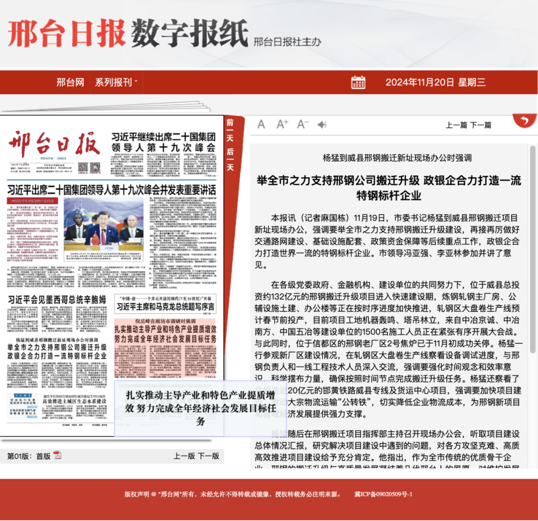 楊猛隨后在邢鋼搬遷項目指揮部主持召開現(xiàn)場辦公會,聽取項目建設(shè)總體情況匯報,研究解決項目建設(shè)中遇到的問題,對各方攻堅克難、高質(zhì)高效推進(jìn)項目建設(shè)給予充分肯定。他指出,作為全市傳統(tǒng)的優(yōu)質(zhì)骨干企業(yè),邢鋼的搬遷升級與高質(zhì)量發(fā)展凝結(jié)著幾代邢臺人的夙愿,對維護(hù)發(fā)展穩(wěn)定大局、實現(xiàn)全市跨越趕超意義重大,全市上下要搶抓“百泉復(fù)涌”歷史新機(jī)遇,增強(qiáng)務(wù)實擔(dān)當(dāng)?shù)呢?zé)任感和分秒必爭的緊迫感,搶抓黃金施工期,舉全市之力破解關(guān)鍵難題、強(qiáng)化要素保障,全力推動邢鋼新廠區(qū)盡快建成投產(chǎn)、老廠區(qū)按時關(guān)停。威縣要提高站位、統(tǒng)一思想,一鼓作氣推進(jìn)服務(wù)保障工作,積極組織銀企對接、產(chǎn)業(yè)招商、產(chǎn)品推介等活動,引導(dǎo)形成全社會支持邢鋼發(fā)展的良好氛圍,切實放大邢鋼新廠輻射帶動效應(yīng),努力打造獨(dú)具特色的特鋼產(chǎn)業(yè)集群。各金融機(jī)構(gòu)要形成工作合力,創(chuàng)新金融產(chǎn)品,主動加強(qiáng)與企業(yè)對接服務(wù),積極爭取上級金融機(jī)構(gòu)支持,為項目建設(shè)提供堅實保障。市直相關(guān)部門要積極對接項目建設(shè),提前介入、靠前服務(wù),吃透用好各項有利政策,拿出幫助搬遷建設(shè)的硬政策硬舉措,形成推動后續(xù)發(fā)展的政策合力,把邢鋼打造成為我市新材料產(chǎn)業(yè)的強(qiáng)力支撐。