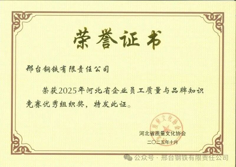 Recently, the results of the 2025 Hebei Provincial Enterprise Employees Quality and Brand Knowledge Contest were announced. Thanks to its excellent organization and outstanding performance of employees in answering questions, Xingtai Iron and Steel Co., Ltd. won the "Excellent Organization Award", and 6 of its employees claimed the first, second and third prizes respectively in the individual category.
